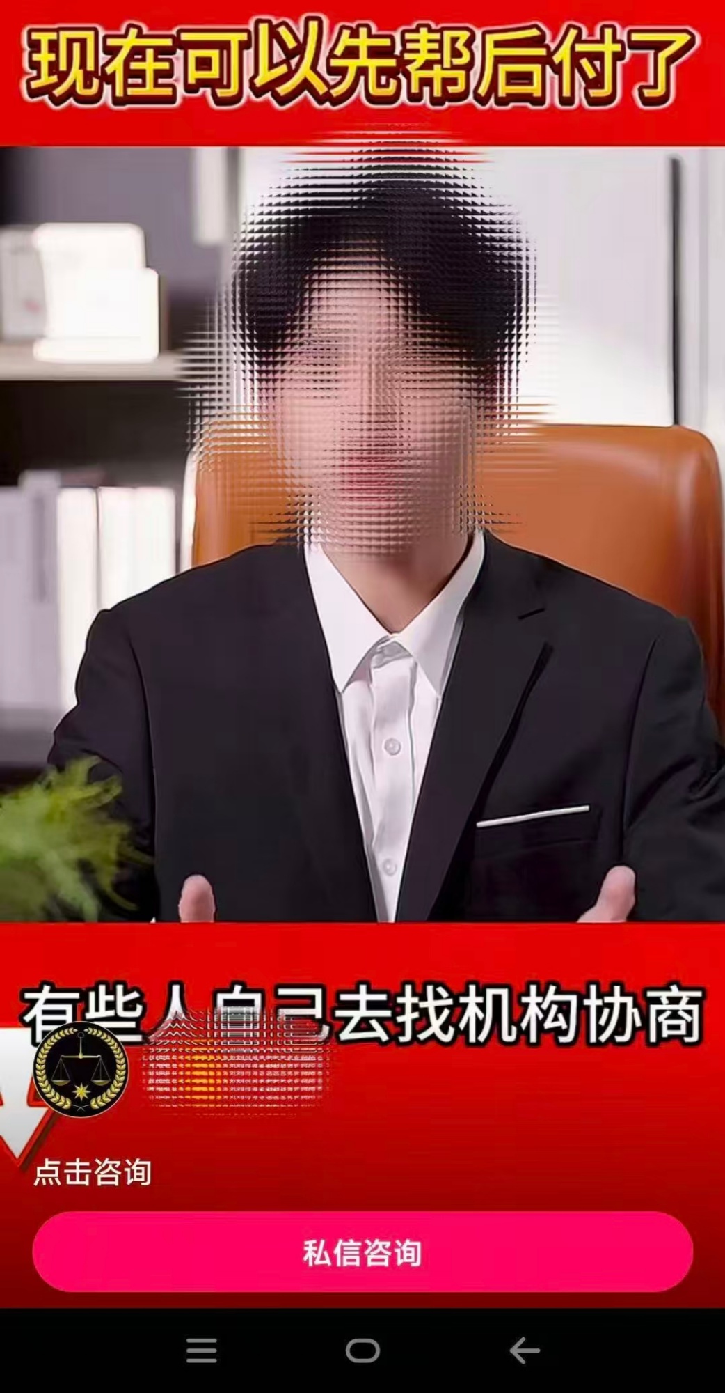 央广网北京9月18日消息(记者刘保奇)“2025好消息,现在可以先帮后付了”“全国教育培训退费服务,专业处理培训退费”“专业处理各类退费纠纷,先追后付”……因为购买的培训课程退费未果,在刷到这些“法律咨询”名义的短视频后,郭威心动了。