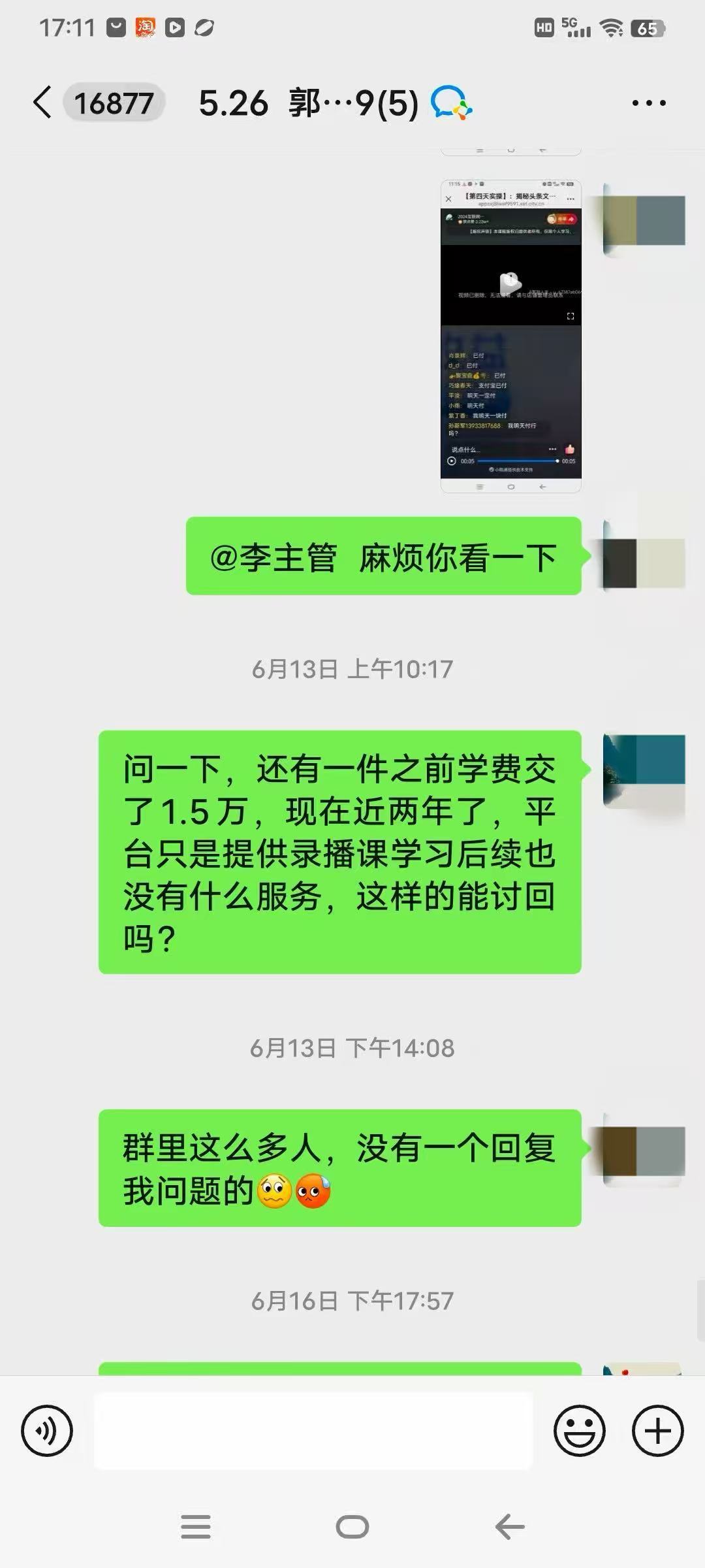 付款之后,群里几乎不再有任何回复。“群里这么多人,没有一个人回复问题,你们律所也是骗人的吗?”从2025年5月26日付款后,每隔几天,郭威就在维权群里询问维权进展,但始终无人回应。