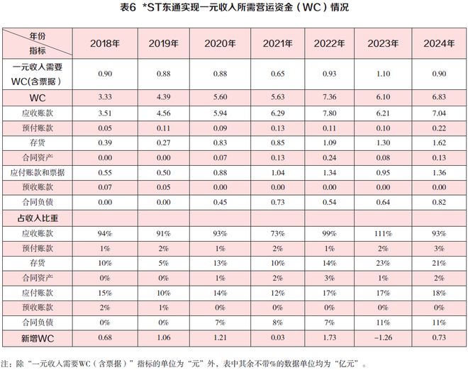 从一元收入需要的营运资金(WC)指标看,*ST东通的情况极不正常,即使在盈利的2018年至2020年,该指标数值都在0.9元左右,2023年则飙升到1.1元。出现这样的数据存在几种可能性:一是商业模式糟糕,需要垫资才能做生意;二是为了拉升销售,采用激进的信用政策;三是与运营相关的资产减值不充分;四是涉嫌财务造假。不管哪种情况,都不是好事。