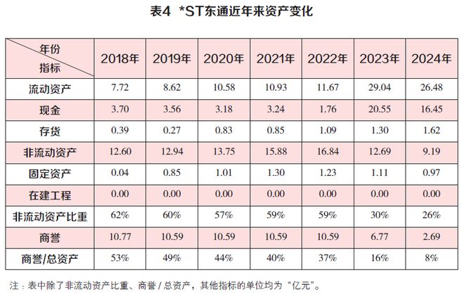 财务数据显示,ST东通的非流动资产比重较高,一家从事软件业务的公司,为什么会这样?再看商誉,公司的商誉很多,表明其采用的扩张策略是并购,一大堆商誉放在账上。资深会计专家李文祥老师曾经说过,商誉就是个“洋泡泡”。洋泡泡是上海话,意思是小孩子玩的气球。气球只有两个下场,要么爆掉要么瘪掉,最终都化为乌有。所以,如果商誉占资产的比例高,那么不管是爆掉还是瘪掉,都会对利润产生巨大冲击。ST东通2023年的商誉下降,可能存在商誉减值。