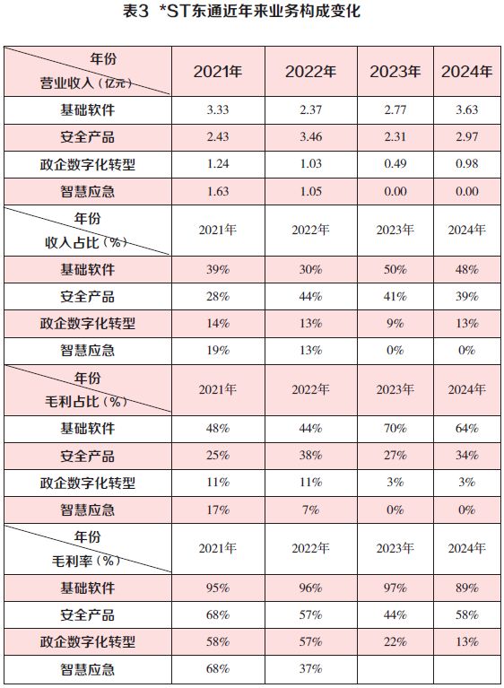 从2021年至2023年*ST东通的业务构成看,有四大类型的业务。基础软件就是券商研究报告里说的中间件,是占比最高的核心业务,但该业务从2021年的3.33亿元降到了2023年的2.77亿元。排在第二位的安全产品业务波动剧烈,但行业常识告诉我们,做安全这块业务的软件公司业绩普遍不理想。2023年智慧应急业务彻底消失,政企数字化转型基本上也没了。如果我们把基础软件理解成基本盘,其他业务是发展出来的第二曲线、第三曲线。我的直观印象是,基本盘在下滑,新业务基本没干成。