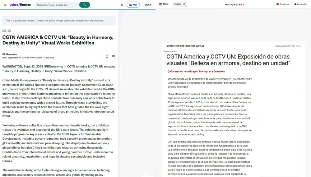 截至目前,“和合之美 命运与共”联合国影像展相关报道被美国、加拿大、英国、德国、西班牙、日本、韩国、阿联酋、印度、马来西亚等47个国家和地区的1192家主流媒体转载转发。