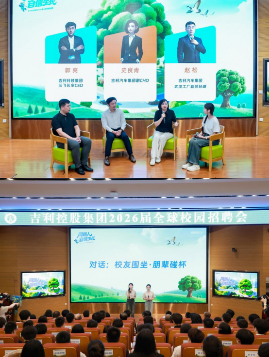 9月23日,以“同路人自信生长”为主题的吉利控股集团2026届全球校园招聘会首场活动走进吉利学院。吉利控股集团副总裁兼首席人力资源官(CHO)潘雷方出席活动并作主题演讲。吉利人才发展集团副总裁隋姗姗、吉利汽车集团副CHO史良青、远程新能源商用车集团副总裁兼CHO后毅、吉利科技集团总裁助理兼CHO朱贝妮、吉利科技集团沃飞长空CEO郭亮、吉利汽车集团极氪成都工厂副总经理冯旭红、莲花科技武汉工厂副总经理赵松、吉利学院校长阙海宝与百余名学生共同见证这一重要时刻。吉利学堂校长兼人力共享中心总经理金亚平主持招聘会。